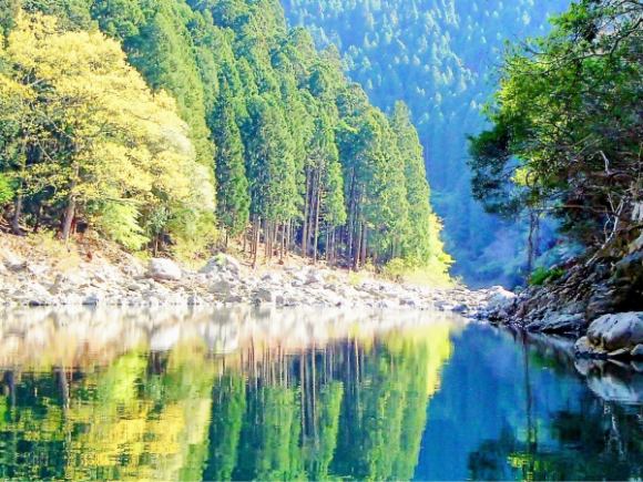 | 【6】朝日の瀬 | 深い渓谷に差し込む朝日が美しい瀬です。ナイスビューのおすすめポイントです。 後半には大きな波が集中し、ラストは大きな岩が行く手を阻むワクワクするクライマックスです。 |
