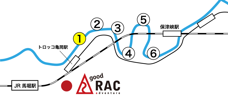 ※通常の保津川ラフティング(半日のみ)の川地図です。ファミリーラフティングは異なります。