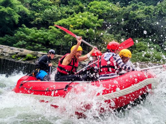 | 【5】ラフティングツアー開始 | <午前の部>9:40 / <午後の部>14:10 いよいよ保津川ラフティングツアーのスタートです。 ボートに乗るとテンションが一気に上がります。 さあ、大自然を満喫しながら約2時間20分!チーム全員で一致団結するのがポイント! 緩やかポイント・激流ポイント、またトロッコ列車やJRを眺めることもできる欲張りコースが保津川ラフティングの特徴です。 途中、ボートを使った川遊びや3mの岩場からの飛び込みなど、ラフティング以外もたっぷりと楽しんでもらいます。 激流ポイントではガイドが声掛けしますので安心してくださいね。 スタートからゴールまで笑いの絶えないツアーです。 |