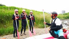 | 【4】スタート地点へ移動 | <午前の部>9:10 / <午後の部>14:00 ガイドと一緒にスタート地点へ徒歩5分程移動していただきます。 スタート地点では、RAJ(ラフティング協会)認定指導員監修の下で制作された安全説明を聞いていただき、 楽しみ方も危険回避の方法もしっかり覚えていただきます。 漕ぎ方の説明や、ボートへの乗り方など安全で楽しいツアーを行っていただくため、 また初めての方でも安心してご参加いただけるように担当ガイドが丁寧にご案内いたします。 しっかりと聞いてくださいね。 |